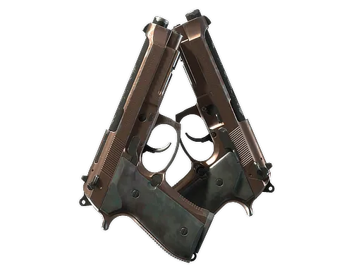 Firing two large-mag Berettas at once will lower accuracy and increase load times. On the bright side, you'll get to fire two large-mag Berettas at once. The metal of these Dual Berettas has been painted rose gold and the grips are a nacred, deep jade color.