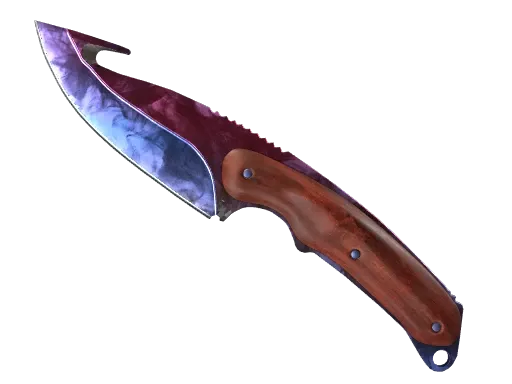 The most notable feature of a gut knife is the gut hook on the spine of the blade. Originally popularized as an aid for field dressing game, the gut hook is also effective at cutting through fibrous materials like rope, webbing, or safety belts with ease. It has been painted with black and silver metallic paints using a marbleizing medium, then candy coated.